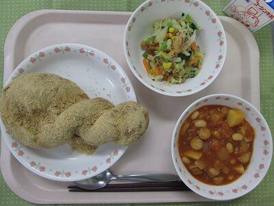 牛乳・揚げパン・れんこんサラダ・ウインナーと豆のトマト煮込み