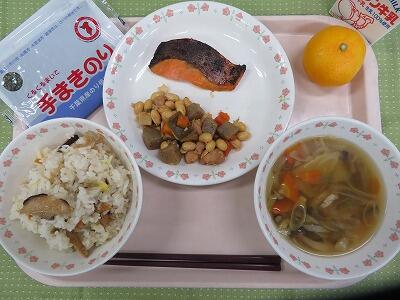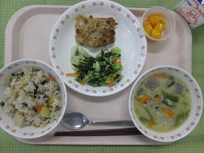 牛乳・秋の香りごはん・とり肉のごまみそ焼き・白菜のこんぶ漬け・呉汁・もも缶