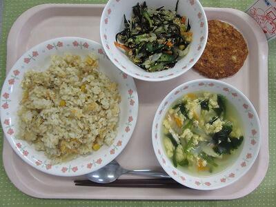 牛乳・野沢菜チャーハン・豆腐とたまごのスープ・いがぐり揚げ