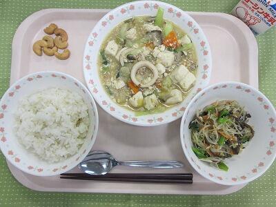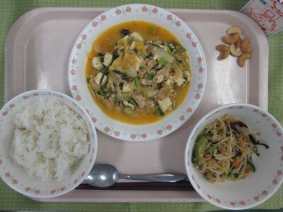牛乳・ごはん・キムチどうふ・中華サラダ・炒りカシューナッツ