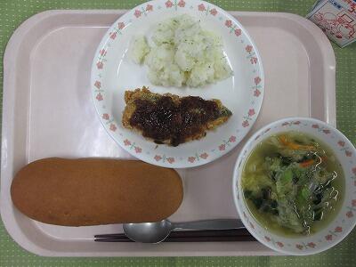 牛乳・ブランコッペパン・しいらのカレーフライ・ガーリックポテト・千切り野菜スープ