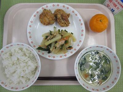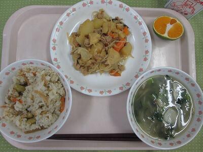 牛乳・わかめごはん・はたはたのから揚げ・五目豆・きりたんぽ汁・ぽんかん