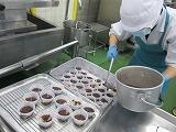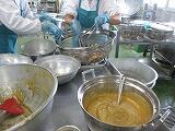 今日はバレンタインです。給食室でもみんなのためにチョコマフィンを焼きました。バターを白っぽくなるまで泡だて器で混ぜます。中はしっとり、周りはカリカリに焼きあがりました。