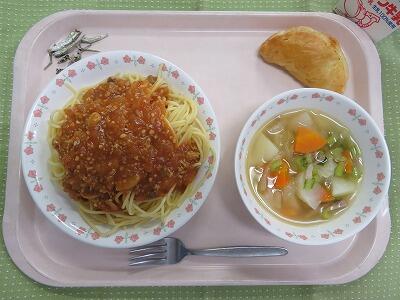牛乳・スパゲティミートソース・かぶのスープ・パンプキンパイ・小魚