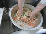 今日は給食室でミートボールを作りました。一人2個以上食べられるように、重さをはかって一つずつ丸めて全部で1500個ほどのミートボールを作り、オーブンで焼いてトマト味のシチューにいれました。冬野菜の代表、ブロッコリーも茎の部分は角切りにして、栄養たっぷりのシチューを作ってくれました。