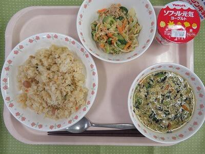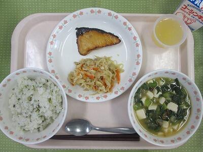 牛乳・青大豆ごはん・ししゃものからあげ・じゃがいものきんぴら・ほうれん草と厚揚げのみぞ汁・パイン缶