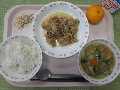 牛乳・ごはん・さばのおろし煮・キャベツとたくあんのごま和え・みそけんちん汁・はるみ