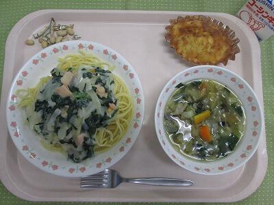 牛乳・大根とツナのスパゲティ・せんぎり野菜のスープ・りんごの米粉ケーキ