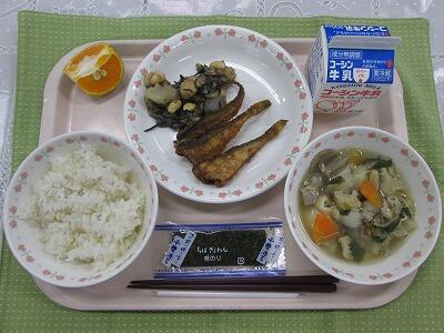 牛乳・ごはん・さばの香味焼き・切干大根のにもの・みそけんちん汁・みかん