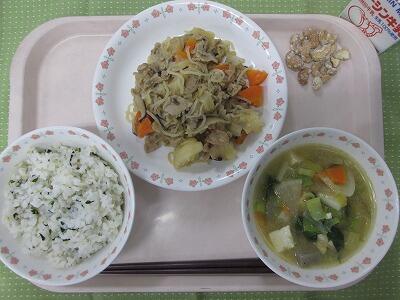 ふりかけは大正のはじめにカルシウム不足をおぎなうために考えられた「ごはんの友」がはじまりだそうです。豚汁のだしをとったかつお節にちりめんじゃこやごまを合わせて、甘めの味つけで給食室で作りました。ごはんにぴったりで、カルシウムもたっぷりです。