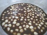 さばは大根おろしをいれたタレを煮立て、さばを加えて大きな釜で煮込みました。