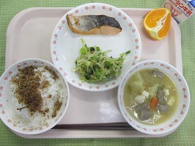 牛乳・ごはん・ちりめんふりかけ・鮭の塩焼き・からしあえ・豚汁・はるみ