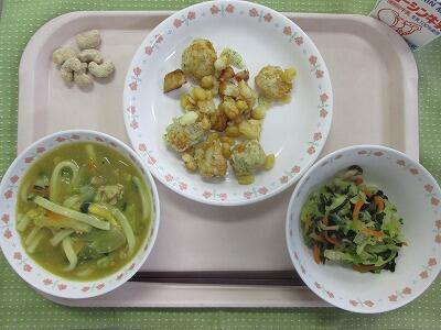 牛乳・カレーうどん・豆ちくわと大豆のいそべ揚げ・いそかあえ・メープルカシューナッツ