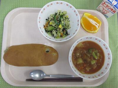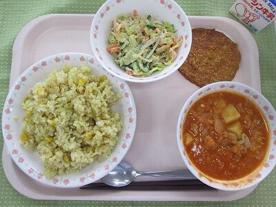 牛乳・ドライカレーライス・アーモンドいりポテトサラダ・キャベツのスープ