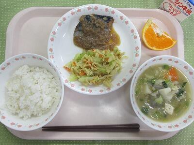 牛乳・ごはん・さばのおろし煮・キャベツとたくあんのごま和え・みそけんちん汁・はるみ