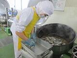 煮魚は給食室の大きな釜で煮るので味がしっかりしみています。今日はごま風味のみそ味です。