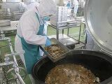 今日のメインのおかずは「肉じゃが」です。700食分ほどを作るのに約50Kgのじゃが芋と20Kgのぶた肉を使いました。それでも「もっと食べたい」とみんなが好きなメニューですね。今日のふりかけにはみそ汁のだしをとった後の「かつお節」と「こんぶ」を使い、ちりめんじゃことごまを加えて作った栄養たっぷりのふりかけです。ごはんは柏市のお米で、食が進みました。