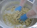 オートミールとココナッツ、小麦粉、砂糖をよく混ぜ、バターとはちみつ、重曹を加えてよく混ぜます。