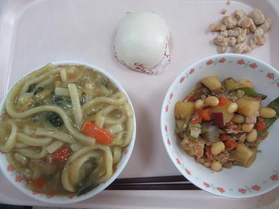 今日はカレーうどん。カレーうどんは醤油だしでカレーができているので、うどんとの相性がよく、つるつるとたくさんいただけてしまう。うどんが冷凍を使えるようになり、こしのあるカレーうどんがとてもおいしい。野菜のごま煮は、初めて食べたメニューのようである。ごまをたっぷりと使ったタレで煮込まれており、おいしい。肉まんがついているのも珍しい献立で、肉まんらしいおいしい味であった。