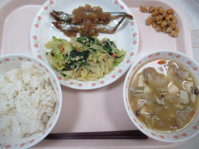 2月6日 焼きししゃもの玉ねぎソースかけ アーモンドあえ 芋の子汁 かりかり大豆