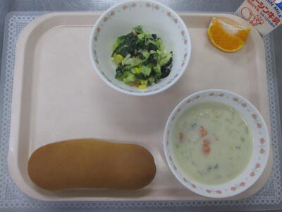 今日はパン食の献立でキャロットパン。人参のすりおろしがパン粉に入った少しオレンジかかった色合いのパンで、味に人参を感じることは無いが、なんとなくふんわりとした弾力を感じるパンである。そこにえびと大豆のシチューで、米粉のシチューなので少しあっさりとしているが、えびがしっかりと入って食べ応えもあり、おいしいシチューに仕上がっている。わかめとコーンのサラダは、あっさりとすっぱさもあるドレッシングで仕立てられて、わかめがおいしくコーンの甘味も引き出す味になっている。今日の柑橘は「はるみ」で、甘味とジューシーさのある柑橘でおいしかった。