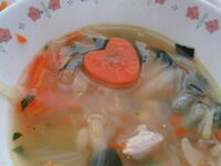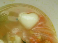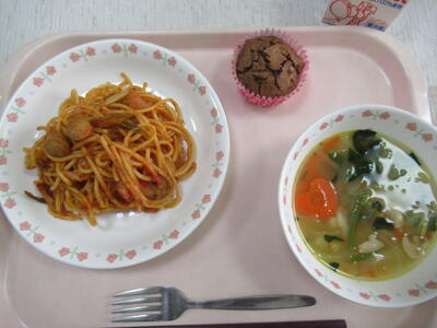 今日は子供たちにも人気があるナポリタン。ソーセージが入りケチャップでの味付けは、私たちは昭和を感じる懐かしい味付けでとてもおいしい。スープは野菜たっぷりにお餅も入った洋風の透明なスープ。ニンジンがハート形、お餅もハート形、そしてデザートはチョコカップケーキで、そう今日はバレンタインにちなんで献立であった。