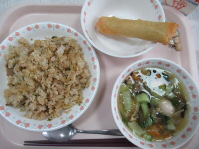 2月16日 キムチチャーハン スイートポテトの包み揚げ うずら卵と春雨スープ 大豆小魚