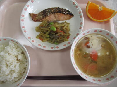 2月17日 鮭のごまみそ焼き カレーきんぴら 打ち豆の味噌汁 清見オレンジ