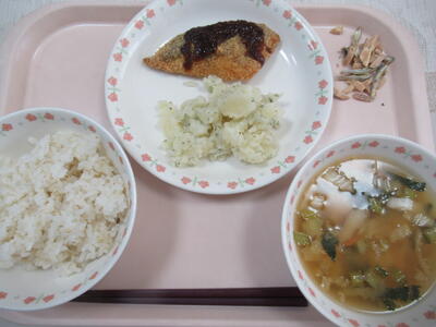 2月19日 鰆のフライ ガーリックポテト 白菜の味噌汁 アーモンド小魚