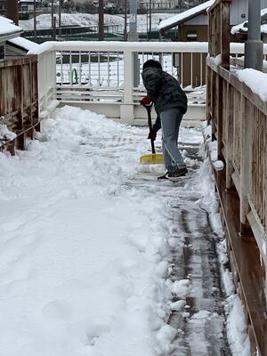 1時過ぎに学校に到着すると、校門のところで6年生と会いました。「これから歩道橋の除雪をするけど、一緒にやってくれる?」と聞くと、「はい」との返事。30分くらい手伝ってくれたので、大変助かりました。さすが、富勢小の6年生です。