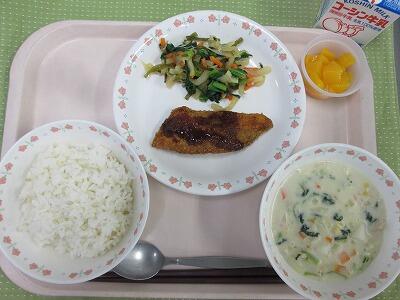 牛乳・ごはん・たらのフライ・大根とじゃこのサラダ・かぶのポタージュ・もも缶