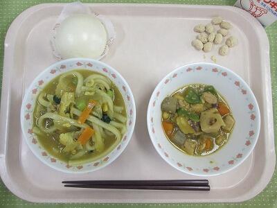 牛乳・カレーうどん・野菜のごま煮・ミニ肉まん・きなこ大豆