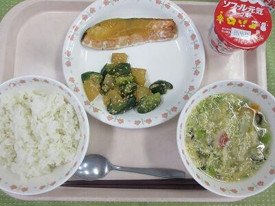 牛乳・ごはん・鮭のゆずみそかけ・きゅうりとだいこんのごまだれかけ・たまごと白菜のすまし汁・ヨーグルト