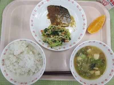 牛乳・ごはん・いなだの照焼き・おかか和え・柏野菜のみそ汁・みかん・カリカリ大豆