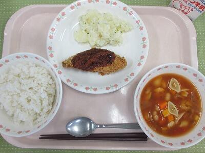 牛乳・ごはん・白身魚フライ・ガーリックポテト・ミネストローネスープ