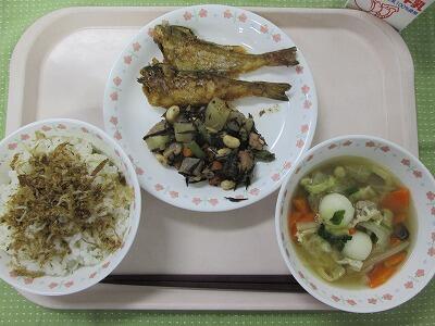 牛乳・ごはん・手作りふりかけ・はたはたのから揚げ・大豆の磯煮・だまこ汁