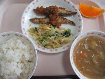 ししゃもの玉ねぎソースがけ からしあえ 豚汁 清見オレンジ