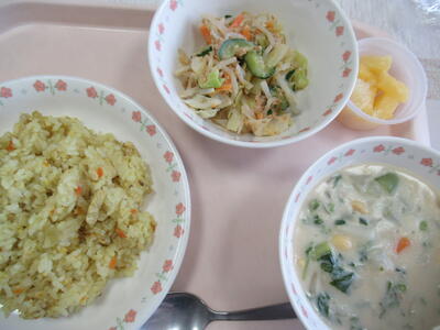 今日は給食室からカレー粉のいい香りが漂ってきた、カレーピラフがメインである。ターメリックで黄色くなったご飯に細かく刻まれた野菜や鶏肉がちりばめられて、美味しそうな香りと彩りである。いただくとカレーの香りが鼻に抜けてご飯もパラパラとして美味しいのだが、少し味にムラが見られてしまうのが残念であった。棒々鶏風サラダは、ごまの香りがあるドレッシングにもやしとキャベツと鶏肉がからんで、しっとりシャキシャキとして美味しい。春野菜のシチューは今日の力が入ったメニューで、米粉のシチューらしくさらっと感があり、かぶ、菜の花が春野菜として入って美味しいシチューに仕上がっている。スナップエンドウがアクセントで入っているのも、豆の風味を味わえて美味しい春を運んでいる。パイン缶は甘くて美味しいパイナップルである。