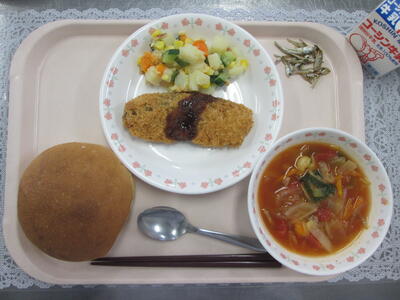 丸パン 鮭フライ ポテトサラダ えびとトマトのスープ 小魚