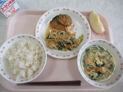 鯖の味噌煮 おかか和え えのきとたまごのすまし汁 りんご