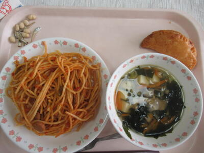 スパゲティーナポリタン わかめのスープ ストロベリーパイ 大豆小魚