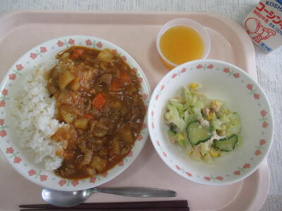 今日は1年生の給食がスタートする日で、カレーが献立である。チキンカレーとスタンダードカレーで、1年生用に少しカレー粉を控えたものも味見をしたが、しっかりとしたカレーにである。ご飯がたくさん食べられそうな味でとても美味しい。ツナサラダは、キャベツときゅうりと玉ねぎがツナとよく合っているあっさりとしたサラダである。オレンジゼリーは手作りのゼリーで、少し柔らかめであるが、ツルッといただける美味しい味である。1年生、保育園や幼稚園で経験した給食を小学校でも引き継いで、よい食習慣を育てていきたいと思います。