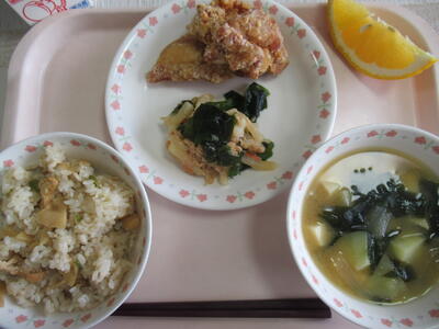 筍ごはん 鶏のから揚げ 大根とツナの和え物 じゃがいもの味噌汁 甘夏みかん