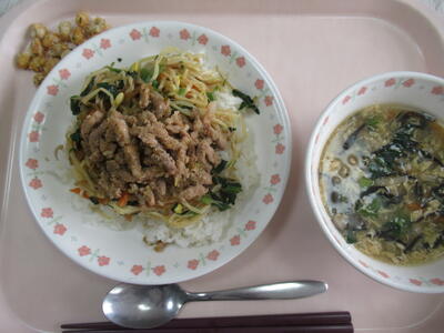 今日は韓国風献立で、ビビンバである。豚肉の細切り肉に味がしっかりと染みこんで、ご飯と一緒にいただくととても美味しい。もやしベースの野菜も絡めながら、ご飯とお肉と野菜のハーモニーが美味しいビビンバである。かりかり大豆は塩気と揚げと、塩と油で食欲を誘う仕組みで、ご飯ともよく合う味である。ひじきとたまごのスープはひじきに含まれるカルシウムをしっかりと摂取できる献立で、たまごのタンパク質とカルシウムをいただける栄養価の高いスープであった。