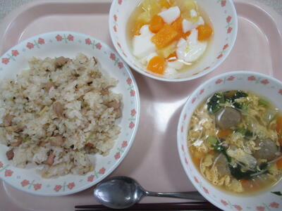 今日は中華風献立で、中華おこわがメインかな?中華おこわはちまきを意識して、餅米を使って少ししっかりとした歯ごたえを感じる。タケノコや干ししいたけが入って季節感もある。焼豚がサイコロになって入っているが、この焼豚にもう少し味が効いていると、おこわの味がしまったのではないかと思う。卵入りいわし団子スープは、いわし団子がドンと存在感を出して入っており、いわしも季節を感じる食材である。たまごの香りのあるスープもよいが、こちらも今日は味の決め手が欲しかった。また、ご飯とスープという感じが強く、いわし団子をおかずのようにして食べたが、箸の動きとしても寂しい感じがあった。杏仁豆腐は美味しいデザートである。
