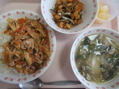 2025年度の給食が始まった。最初の献立は、韓国風献立で、豚キムチ丼とトックのスープである。キムチ丼は、豚肉がたっぷりと入って、キムチの香りがするご飯にしっかりと絡む美味しいどんぶりにしあがっている。ご飯がすすむ味である。トックのスープは、干し椎茸の出汁を感じるスープで、トックからのとろみがあり、小松菜や野菜がたっぷりと入ったスープである。味の深みがもう少しあるとよいと感じ、ごま油の香りや美味しさが出るとさらに良くなると思う。大豆と小松菜の揚げ煮は、カラットした大豆揚げに小魚もパリッとして美味しい味付けである。カルシウムとタンパク質を美味しくいただくことができる。ももの缶詰は桃の香りもよく冷たくて美味しくいただくデザートである。
