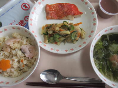 今日は進級お祝い献立で、、花見寿司と名付けられたちらし寿司に、金目鯛の塩焼き。給食で金目鯛が出るのは初めての経験である。ちらし寿司は千葉県産の海苔で巻いていただき、酢が効いて蓮根がシャキッとした食感を味わわせて美味しい手巻きになる。金目鯛の塩焼きもスチームオーブンで焼かれて美味しい味を出しているが、煮付けがいいなあと思うのは贅沢かな。じゃがいものごま酢和えは、初めて食べる味である。単なる煮物にならずに酢が効くことで味に深みと手巻きにも合う味になり、ごまのアクセントもあってとても美味しい。すまし汁はタケノコ、菜の花にたっぷりのネギやわかめが入って、手巻きにあうすまし汁になっている。手作りのココアゼリーもさっぱりとした味わいで美味しいゼリーであった。