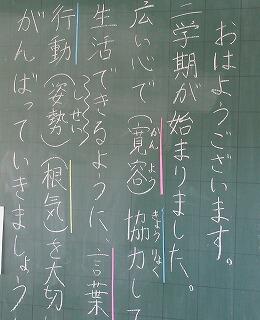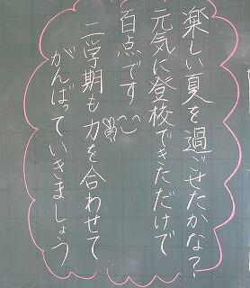 校長の話では、「命を大切にすること、自然災害には考えて動くこと」、「2学期も何かに挑戦すること」を話しました。あいさつもよくできています。靴箱整理もいい。みんな成長しています。