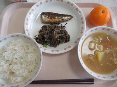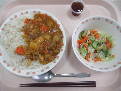 今日は音楽祭で土曜日の給食。今日はカレーにサラダとシンプルな献立だったが、子どもたちは音楽祭で力を発揮したせいか、たくさん食べていたようだ。カレーはしっかりとした味で、ご飯にぴったりと合う美味しいカレーで、フレンチサラダはあっさりとしたドレッシングで美味しいサラダである。