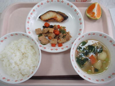 今日も柏市田中産のこしひかりの新米を引き立てる和食献立。こしひかりはみずみずしく美味しく、新米は日本人に生まれてよかったと感じる食感である。そこに今日のメインは銀ダラの西京焼き。西京味噌の甘みと香りに包まれ、ちょうどよい味の西京漬けの銀ダラがふっくらと焼かれて、ご飯を美味しくする味である。高野豆腐のコロコロ煮は、賽の目の野菜と鶏肉が煮込まれて、高野豆腐にちょうどよい味が染みこんで、これもお米を美味しくいただける味である。じゃがいも団子汁はじゃがいもの団子のとろみが効いて、出汁と醤油?で優しい味付けになっている。デザートの早香はミカンの交配種のようで、皮が薄くてむきやすく、甘さもしっかりとした美味しいデザートであった。